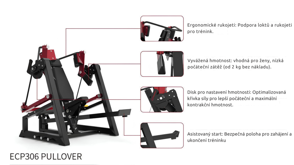 Perfektní biomechanika – konstrukce minimalizuje zapojení bicepsu a umožňuje rozšířený rozsah pohybu až do 220° pro ramenní extenzi.