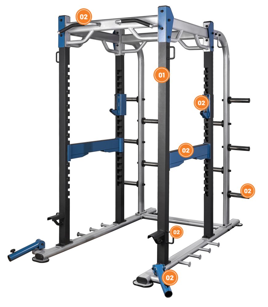 Stabilní Power Rack vybaven kombinovanou bezpečnostními zarážkami, držáky na osu, hrazdou na přítahy a dalším příslušenstvím. Více
