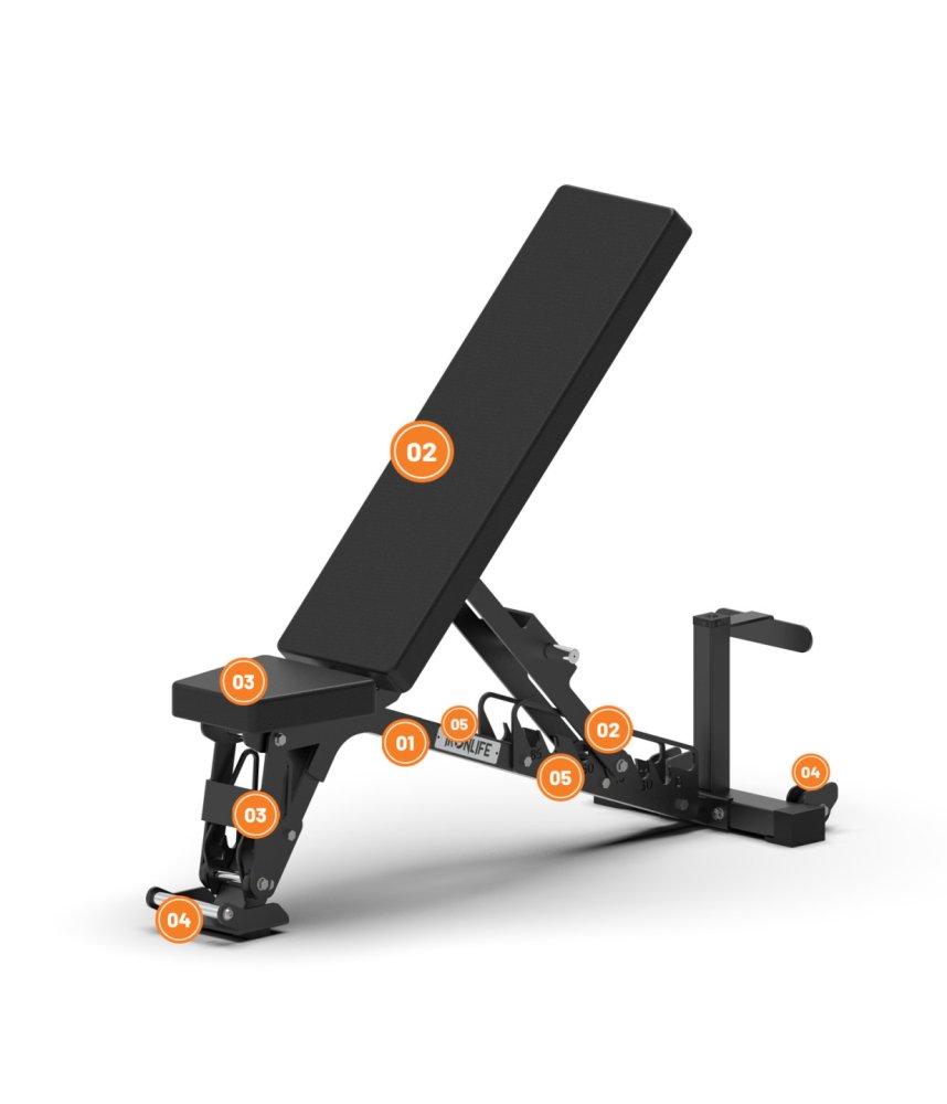 Pečlivě navržený mechanismus umožňuje pevné ukotvení sedací a zádové podložky na místě. Další detaily, jako je kvalitní polstrování, logo IRONLIFE a gravírované označení pozic, dodávají lavici profesionální vzhled.